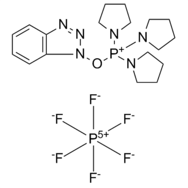 1H-بنزوتريازول-1-يلوكسيتريبيروليدينوفوسفونيوم سداسي فلوروفوسفات (PyBOP) (CAS: 128625-52-5) هو أحد كواشف اقتران الببتيد الأكثر ملاءمة المستخدمة في تخليق الببتيد في الطور الصلب بدون منتجات مسرطنة. كما أنه يستخدم كبديل لكاشف (بنزوتريازول - 1 - يلوكسي) تريس (ثنائي ميثيل أمينو) فوسفونيوم سداسي فلوروفوسفات (BOP). له تفاعل مشابه لـ BOP، لكن منتجه الثانوي ليس مسرطنًا بدرجة كبيرة. PyBOP مناسب بشكل خاص لتخليق الببتيد الصلب - المرحلة، ويتجنب السباق. وعلى النقيض من كواشف الاقتران المعتمدة على اليورونيوم، فإن PyBOP لا يشكل منتجات ثانوية تحتوي على الجوانيدين عند استخدامه بكميات زائدة. وهذا يجعله مفيدًا في تفاعلات تكثيف الأجزاء والدورات من الرأس إلى الذيل.